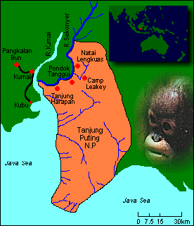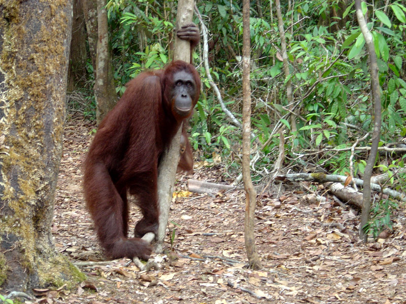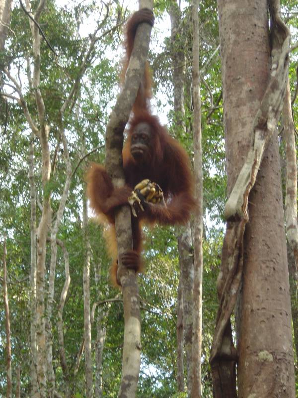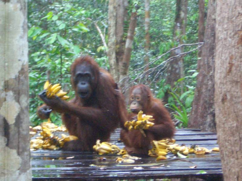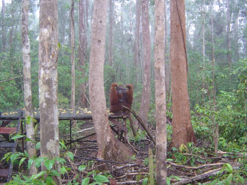 Hundreds of orangutans have been released into the study area over the past decades (Biruté Galdikas and Rod Brindamour first arrived here and founded Camp Leakey in November 1971 and soon began confiscating those kept as pets). Because the area already had a healthy wild orangutan population, competition for food increased so daily feedings are provided for orangutans needing extra nutrition.