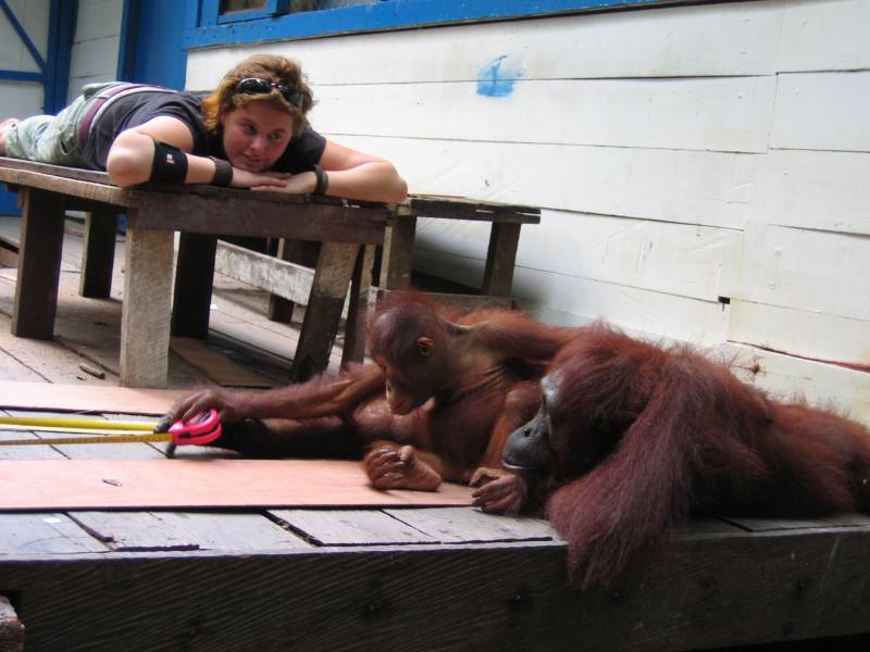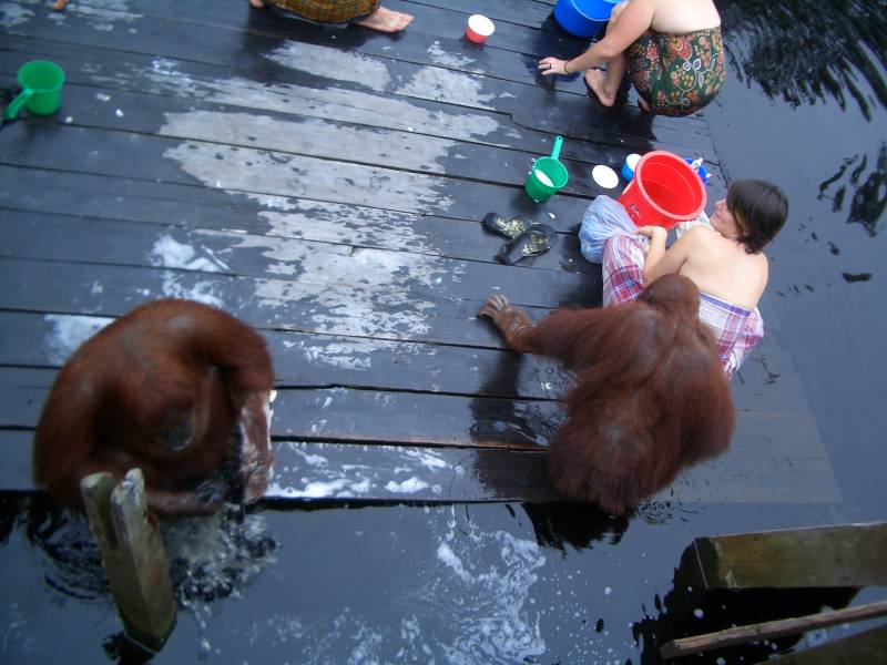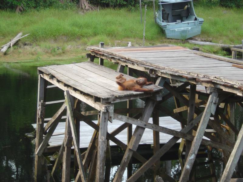 the more likely they are to return to camp to visit the people living there. Walking around Camp Leakey, you are almost guaranteed to see orangutans somewhere. Either near the kitchen/dining room and typing house (where research notes are typed up) or longhouses where the assistants live or down one of the two long jetty's which lead to the river.