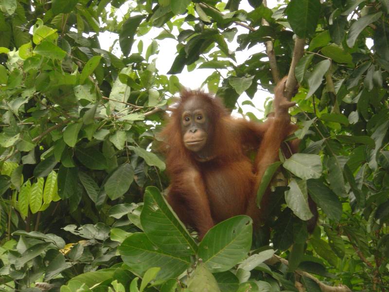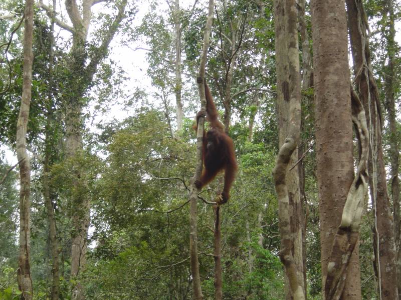 It is difficult to see a wild orangutan in their natural habitat - it usually takes several days of searching in the forest canopy. If you do find one, it will probably be 50+ feet up in the trees so there is no opportunity to see them close up.