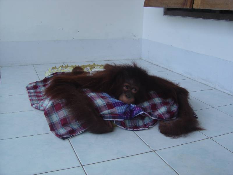 One of the orangutans, Kiki, had recently contracted an unknown disease which paralysed her. She seems to be recovering slowly and now has movement in her head and some in her arm. She is pictured to the right.