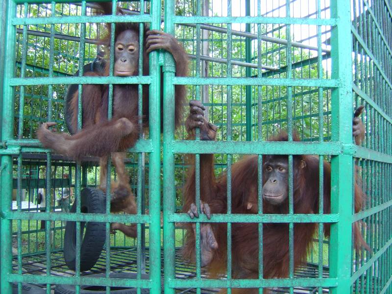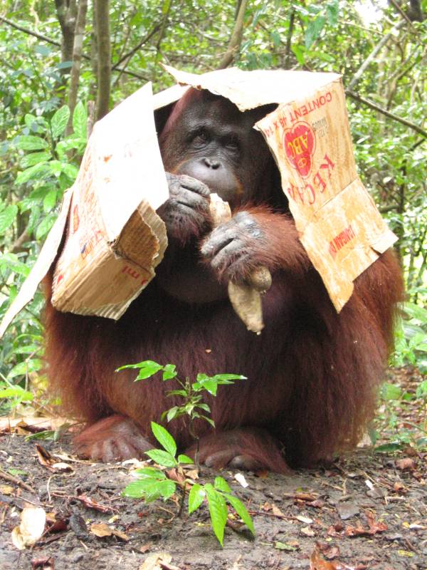 Daily feedings have been given for many years now because ex-captive orangutans have been released into the study area around Camp Leakey. These orangutans may have been illegally kept as pets or may have been driven into contact with humans due to logging or farming. As soon as the Orangutan Foundation becomes aware of such an orangutan, it is retrieved and taken to the Orangutan Care Centre where it is rehabilitated (often they are infants and need caring for until they are 7-8 years old). When it is deemed capable of surviving alone, the orangutan is returned to the wild.