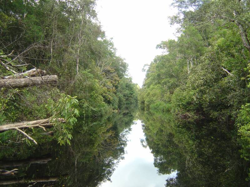and has contributed to the Sekonyer turning from its natural dark colour (due to filtration through the peat bog on which this area of forest lies) to a milky tea colour. The photo shows the clear contrast where a clean tributary from the national park meets the main Sekonyer river.