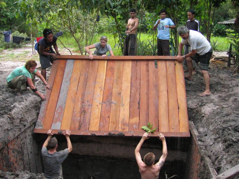 Constructing the toilet building and water tower was fairly straightforward but digging a hole 2.3 metres deep and 3m x 2m square was a different matter! A JCB digger would have done it in an hour but we had just two shovels. It took about 10 days. We calculated that under normal use by four people per day, the hole would take 82 years to fill.